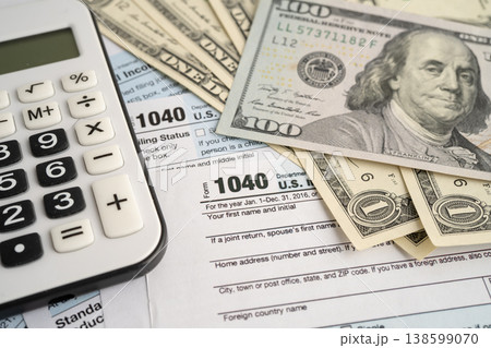 Tax form 1040 U.S. Individual Income Tax Return with dollar banknotes money.