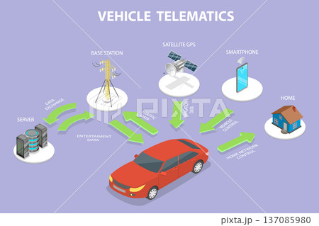 3D Isometric Flat Vector Illustration of Automobile Telematics , Smart Signal Connection System Layout.