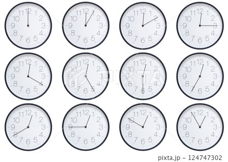 A set of twelve round wall clocks with dark brown frames and white faces showing 5-minute time intervals from 12:00 or 00:00 to 12:55 or 00:55. Clean white background, ideal for time, schedule, and