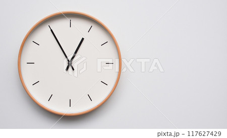 Minimalist wooden Wall Clock on White Wooden Surface with Space for Text. Time Set at 00.55/12.55
