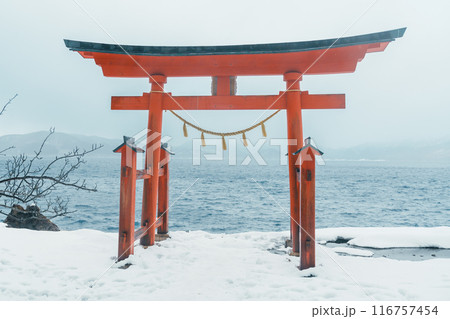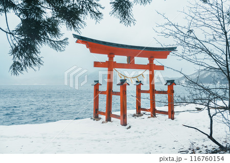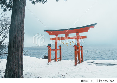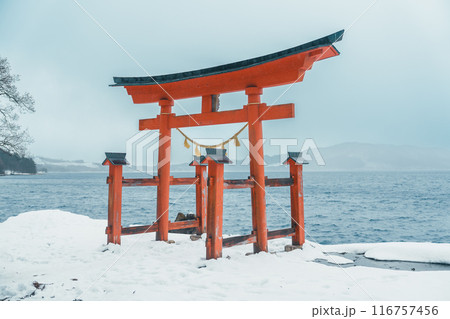 Red Japanese Torii gate of Goza no Ishi Shrine at lake tazawa in winter, located in Semboku city, Akita Prefecture, northern Japan. Landmark and famous for tourists attractions in Tohoku region, Japan