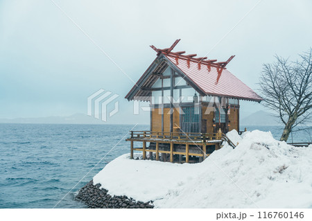 Kansa Shrine and Lake Tazawa with snow in winter season. located in Semboku city, Akita Prefecture, northern Japan. Landmark and famous for tourists attractions in Tohoku region, Japan
