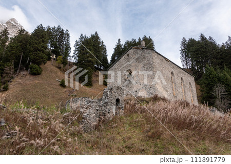 Abandoned gothic church San Gaudenzio at the Maloja pass in Switzerland