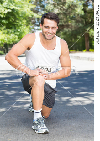 Male runner kneeling on park road holding knee smiling in sportswear with running shoes, bib 1604
