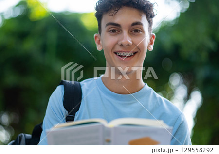 Curly-haired teenager sitting on the bench in the park and reading a book
