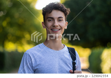 Portrait of teenage guy student with female teacher, mentor looking at camera in library