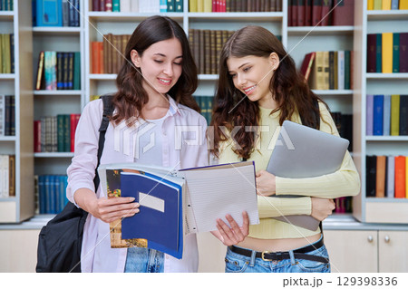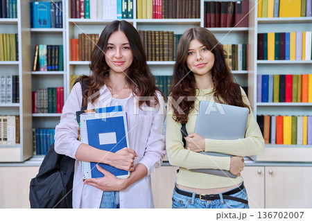 Portrait of two teenage students classmates looking at camera standing in classroom library
