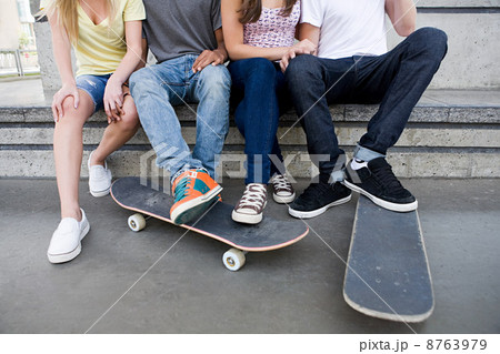 Two friends (12-13,16-17) sitting on sofa and playing with smartphone