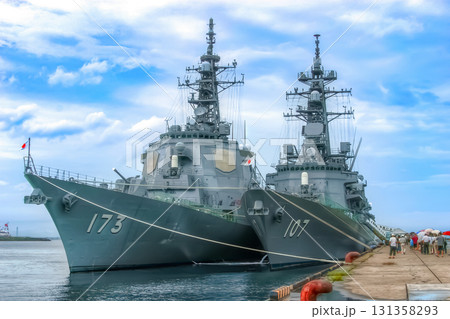 宙斯盾艦“金剛號”和運輸艦“大隅號”停靠在橫濱港大棧橋。