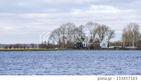 Eemnes pumping station surrounded by flooded meadow in Eempolder, Netherlands after wet season