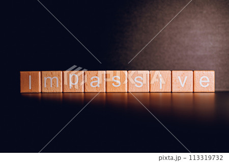 Wooden blocks form the text "Impassive" against a black background.