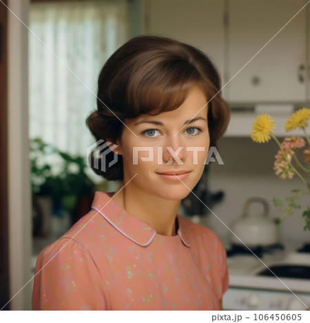 a 1965 woman in a pink dress standing in her kitchen, restored historical vintage photo, generative ai