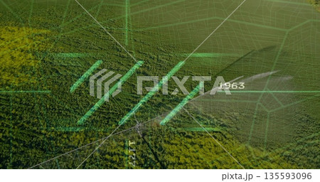 Turquoise bars overlaying forest canopy from above, green grid, map linework and numeric label 1963