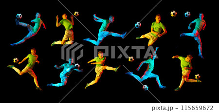 Set, collage. Young man, soccer player in mid-air training, hitting ball in motion isolated on black background in neon light.