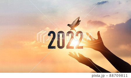 Hands touching of new year 2022 silhouette with flying of free bird enjoying nature on sunset background, Happy New Year concept.