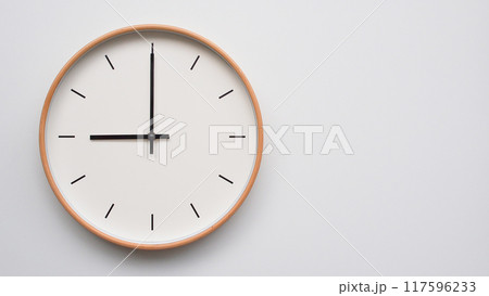Minimalist wooden Wall Clock on White Wooden Surface with Space for Text. Time Set at 09.00/21.00