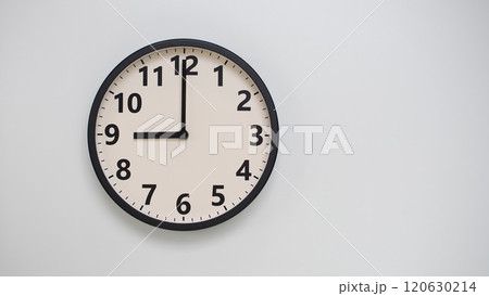 12 o'clock retro clock on white wall. The hands point to 12 o'clock,