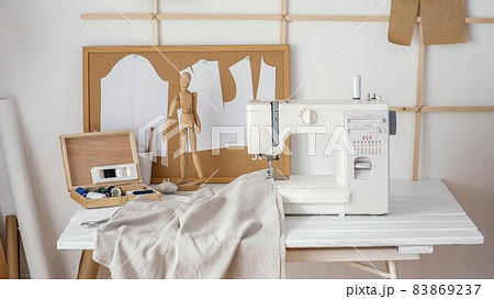 front view tailoring studio with sewing machine. High quality beautiful photo concept