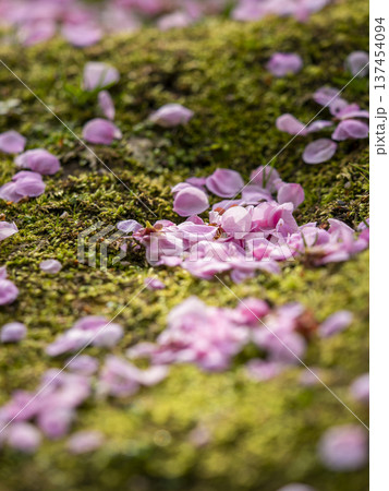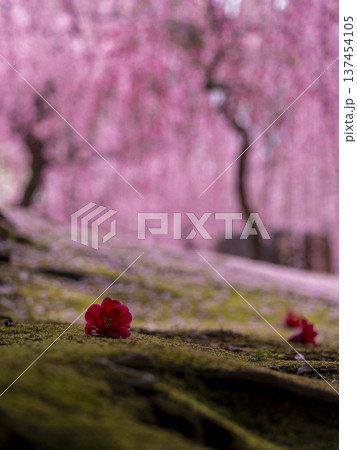 苔蘚花園裡凋落的山茶花和垂枝梅花