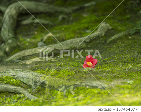 京都城南宮神社苔蘚花園中掉落的山茶花