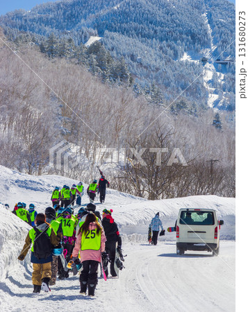 滑雪訓練營期間,一群學生在教練的帶領下沿著雪路行走(長野縣志賀高原)