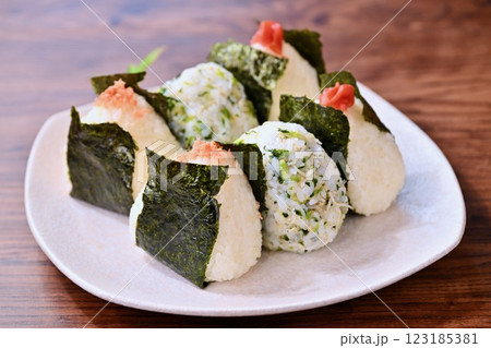 三種飯糰。鮭魚、野澤魚小沙丁魚、醃梅子。