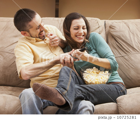 Front view of mid adult couple sitting on couch and fighting for remote control
