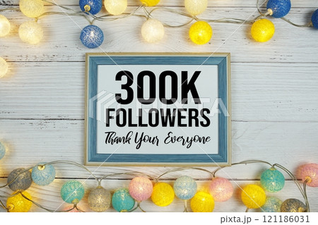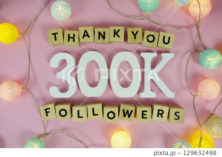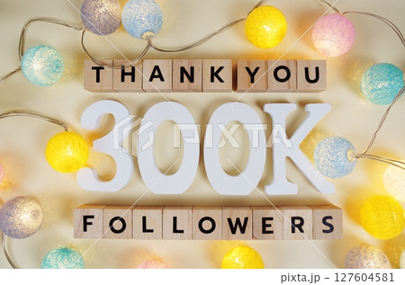 Thanks You 300000, 300K Followers text written on blackboard with LED cotton balls decoration on wooden background
