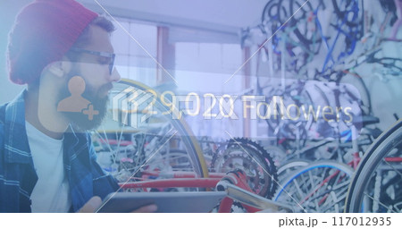Man holding tablet in bicycle shop with 329,020 Followers image over