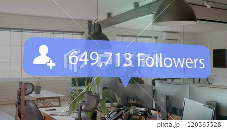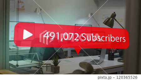 329,020 Subscribers image over modern office workspace with laptop and plants