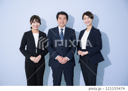多人(4 人)穿著西裝微笑著看著相機,淺藍色背景的圖片