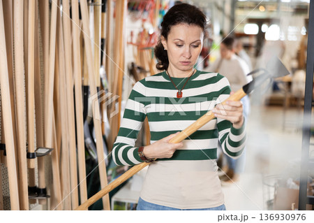 Adult woman choosing hoe in store