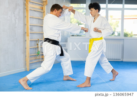 Young male attendee of karate classes fighting with middle-aged man in sports hall