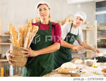 Adult woman baker with basket of baguettes