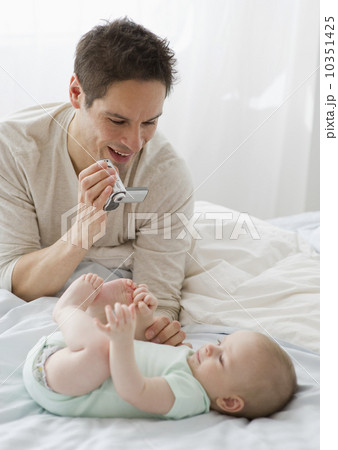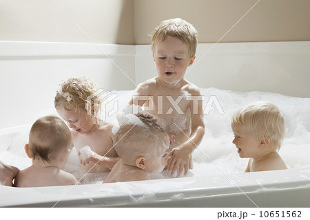 Portrait of siblings (6-11 months, 2-3) lying on bed