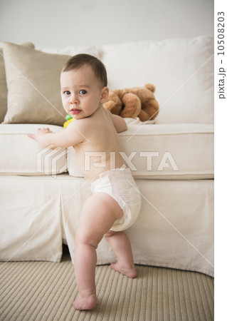 USA, New York City, Brooklyn, baby boy (0-1 years) crawling on sidewalk
