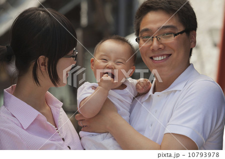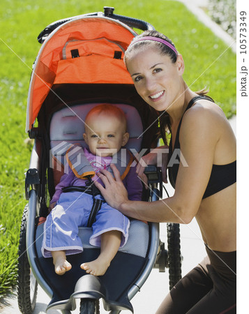 Portrait of smiling woman with baby son (6-11 months) on camping Wasatch-Cache National Forest