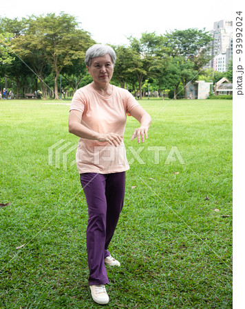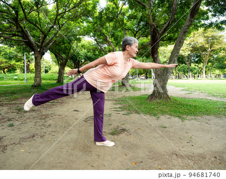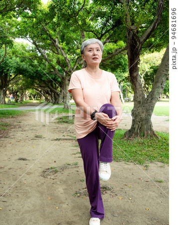 一位60歲的亞洲成熟女性伸展著大腿和大腿,在公園裡享受著大自然的新鮮空氣。