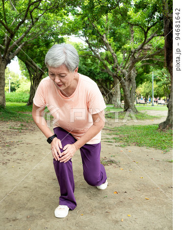 60多歲的成熟亞洲女性在戶外運動因為肩膀痠痛而不舒服