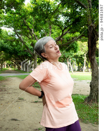 一位 60 歲的亞洲成熟女性在戶外公園裡撫摸著她的腰部,並因背痛或下背部疼痛而生活。