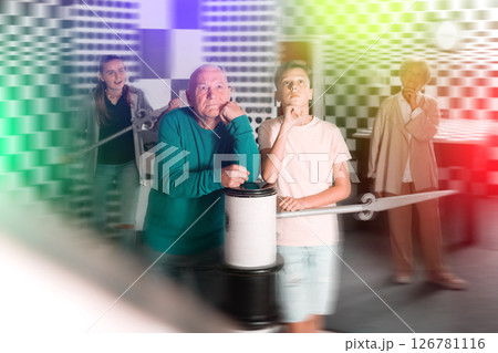 Kids and grandparents thinking about conundrum solution in escape room