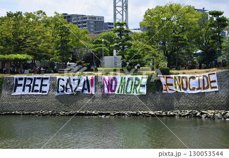 廣島和平紀念公園「解放加薩!不再有種族滅絕」(拍攝於2025年8月6日)