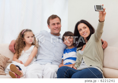 Mother taking family photograph on the sofa