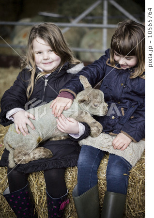 Children and newborn lambs in a lambing shed.