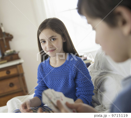Two children at home, sitting side by side and playing a game of cards.