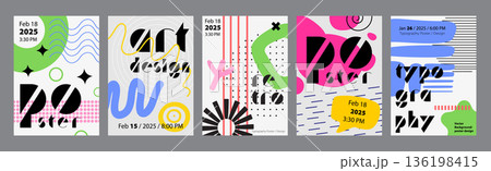Minimalism geometric poster cover set. A4 banners with brutalism simple forms, trendy acid, bold textured shapes, dots grid, more. Modernism art design with Y2K aesthetics. Vector illustration.