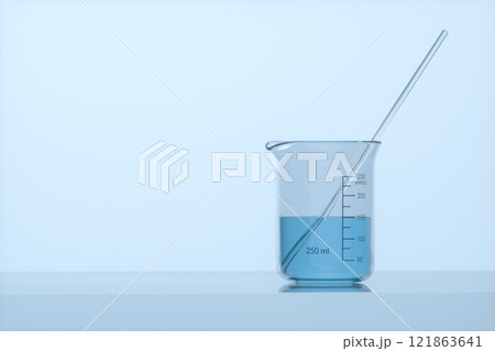 Blue chemistry flasks, beakers, and test tubes with liquids in a scientific laboratory setting for medical and biological research