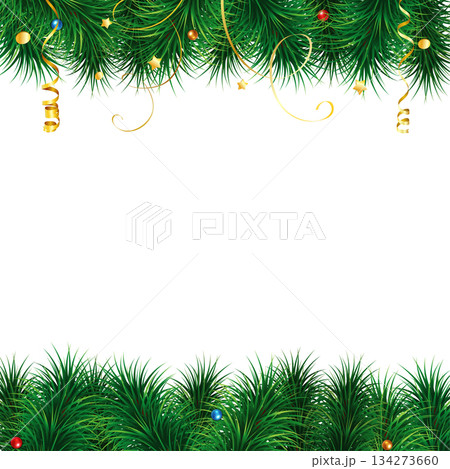 Seamless Christmas fir garland with pearl bead decoration. Watercolor Christmas illustration for New Year's designs. Seamless fir branch border for greeting cards