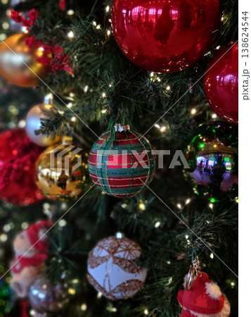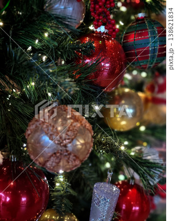 Close-up of Christmas tree branches decorated with colorful ornaments and ribbons. Festive detail, seasonal decor, winter celebration and traditional holiday design.