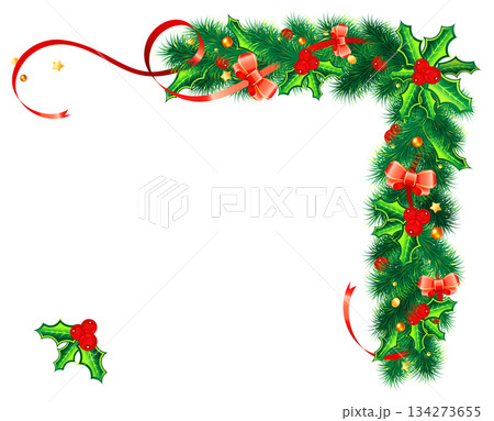 Detailed view of Christmas ornaments and garlands on decorated fir tree. Holiday decoration, winter celebration, festive atmosphere and traditional seasonal styling.